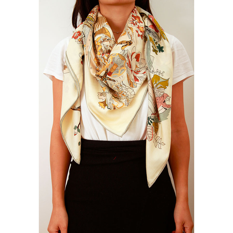 Ajoutez une touche de luxe et de sophistication à votre tenue, grâce au carré laine et soie roulotté à la main avec une double impression qui permet d’avoir deux coloris différents sur chaque face.